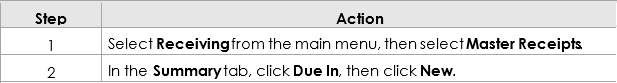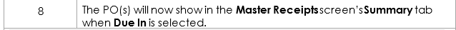 In the Summary tab, click Due In and locate the Master Receipt from the list and click once to highlight that Master Receipt |
