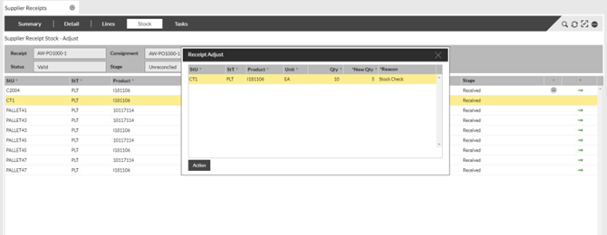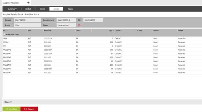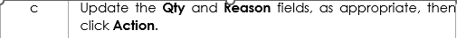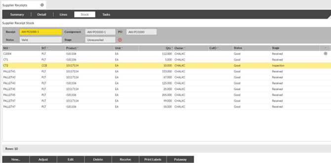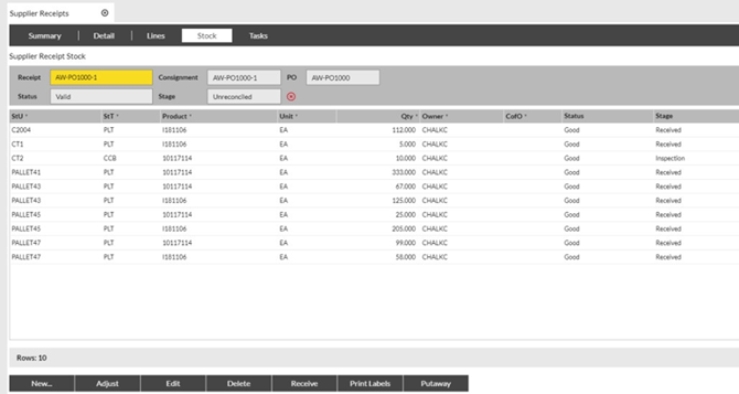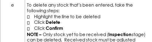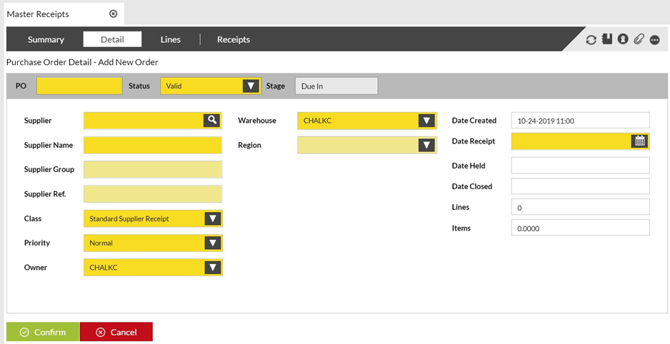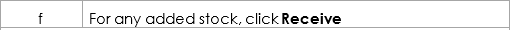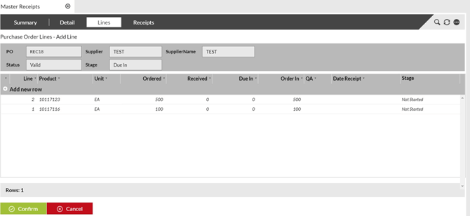 Fill in the following fields for each receipt line (press Tab to move to the next field): • SKU (click Browse to find the code or type it in) • Unit (defaults to unit of measure that was set up for the product [EA]; select from dropdown list to change this, if necessary) • Ordered (quantity to be received; advised quantity automatically populates) • QA (select code from dropdown list if known, and if same code applies to all stock being received) This can be Left blank. |