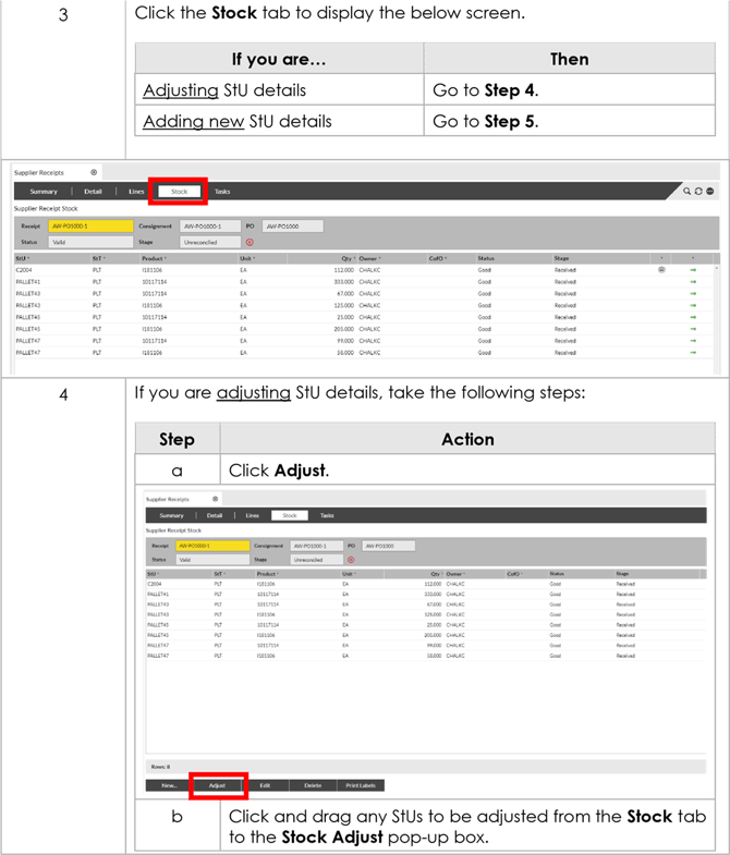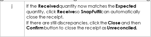 Purpose: During the receiving process, if there were any discrepancies between stock received and stock expected, the receipts will move to an Unreconciled stage and will show in the Arrived list (in the Supplier Receipts option within Receiving) with a red X beside the receipt. You must investigate any discrepancies and rectify them in SnapFulfil. The following table outlines the steps for this process.