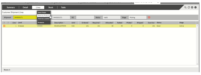 First, hover over the product code in the Lines tab (either in customer shipments or loads) and then select the Stock by Product option.