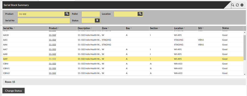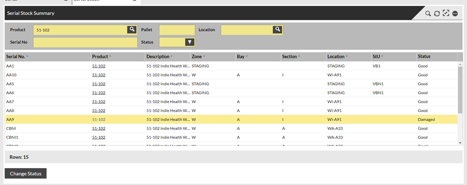 To change the status of a perticular serial slect the “change status” buttom on the bottom of the screen. Then Drag in or double click the serial into the pop up window. |
