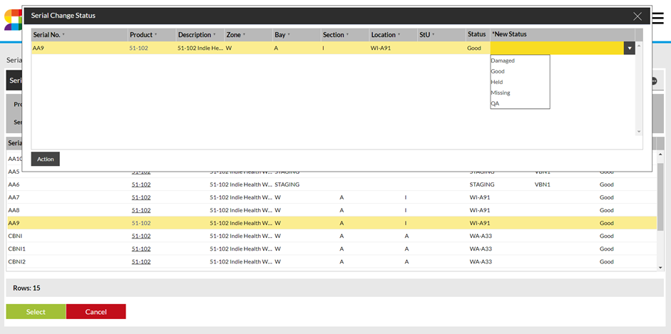 Once the serial is in the pop-up window click on “new status” in the right-hand corner. Another pop-up will give you statuses to choose from. Once you have chosen a status, click action and confirm. |
