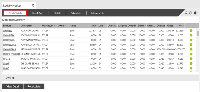 Select the Stock Totals tab to view a summary of all products in stock, stock expected to be received, and stock expected to be dispatched. |