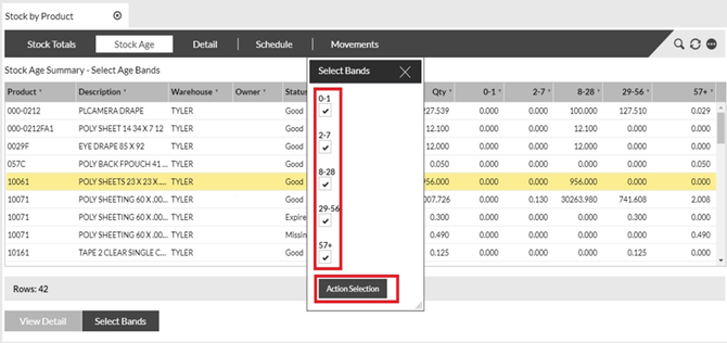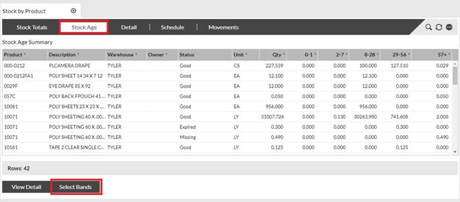 Select the Stock Age tab to view details about how long stock has been in the warehouse. To select different timelines to view, click Select Bands and go to Step 3a.