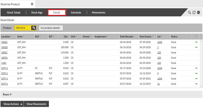 Select the Detail tab for detailed information regarding in which zones and locations the product is located. |