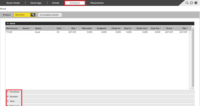 Select the Schedule tab to view information regarding on which current receipts and orders the product exists. Within this tab, you can select the Stock, Master Receipts, Receipts, Master Orders or Shipments tabs. |