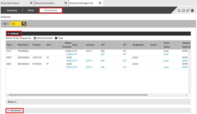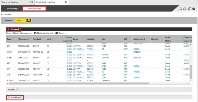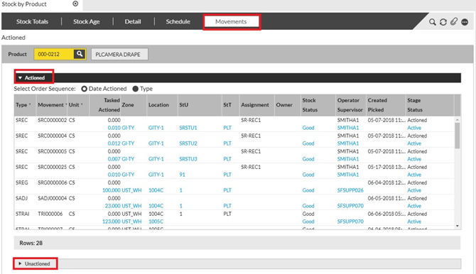 Select the Movements tab to view all movements that have taken place for the stock. Within this tab, you can select the Actioned tab to view movements that were already completed, or the Unactioned tab to view movements that have been generated but not yet completed. |