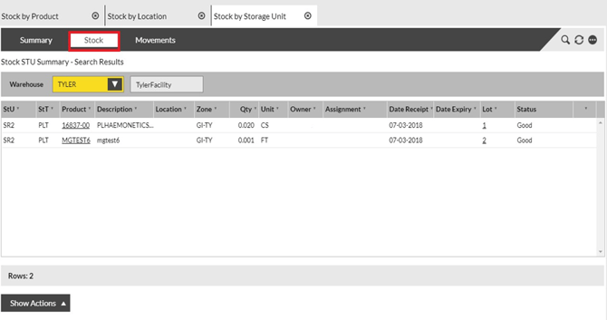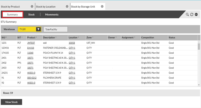 Select the Summary tab to view details of individual StUs. Only stock in a location that retains the StU number is shown in this option. |