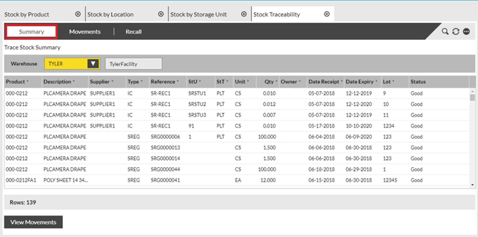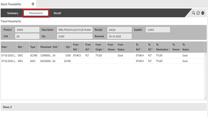 Select the Movements tab to view all movements that have taken place for the stock. |