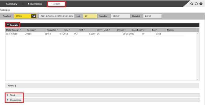 4 Select the Recall tab for a history of all receipts and shipments associated with the stock. Within this tab, you can select the Receipts, Stock or Dispatches tabs. |