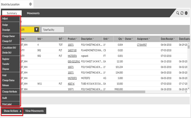 Purpose: If you are on a page within the Inventory menu that displays the Show Actions button, you can click it to access the Show Actions pop-up window and perform various actions on stock. Once an action has been selected, an additional window will pop up and allow you to click and drag stock into the window for actioning.
