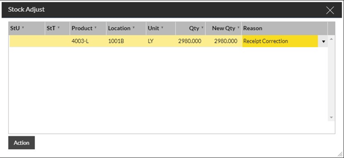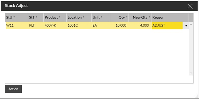 Click on Show Actions, Choose Adjust and drag in the inventory line into the dialog. The New Quantity can be entered. A Reason Code is selected. The Action button is then clicked. |