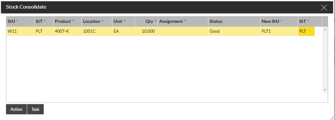 Allows two pallets of stock to be combined as one pallet. You can do this one of two ways: • Click Show Actions, Choose Consolidate Stu and drag in the inventory line into the dialog. Choose the New Stu and Stt and click Action to combine it in the system. • Create a Task for an RF operator by clicking Task to perform. The stock will show as combined in the system when the RF job is completed. |