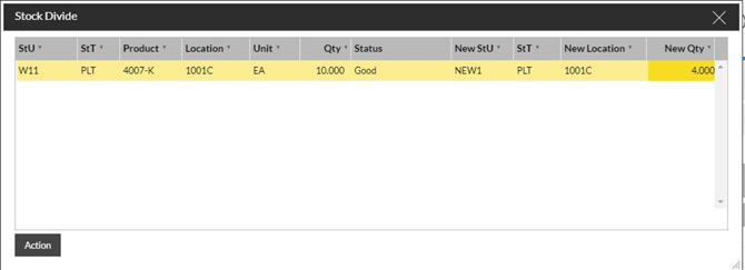 Click Show Actions, Choose Divide Stu and drag in the inventory line into the dialog. Choose the New Stu and StT and click Action to divide it in the system. |