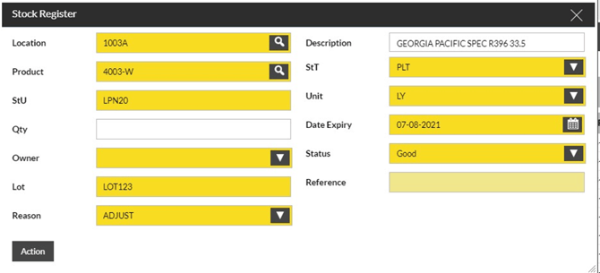 Click Show Actions, Choose Register. Enter Location, Product Number, (Stu and StT only if required), Quantity, Date Expiry (if required),Lot (if required), Rev level, Reason Code. Click Action. |