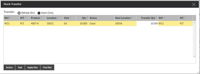 Allows all or part of a pallet to be transferred to another location. If with the transfer you are changing the STU, choose the Divide STU option to perform the Transfer You can do this one of two ways: • Click on Show Actions, Choose Transfer, Choose Stu or Item and drag in the inventory line into the dialog. The New Location and Quantity (for Item Only) can be entered and the Action button is then clicked. • Create a Task for an RF operator to perform. The stock will show in the new location when the RF job is completed. |