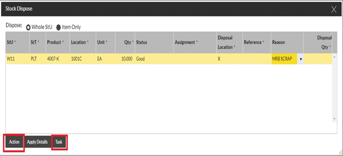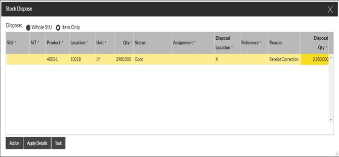 Allows stock to be written off the system, both full and partial pallet quantities. You can do this one of two ways: • Click on Show Actions, Choose Dispose, Choose Stu or Item and drag in the inventory line into the dialog. The Disposal Location, Reason Code and Quantity (for Item Only) can be entered and the Action button is then clicked. • Create a Task for an RF operator to complete. The stock will be removed from the system when the RF job is completed. |