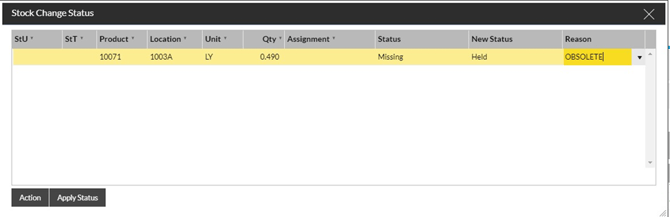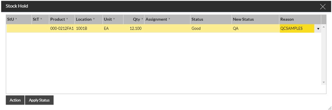 Allows stock to be held and released. Hold: Allows to hold stock from a Good to a non-good status making it unavailable for picking Release: Allows a held product to be released. Will only be available if the stock is at non-good status. Release will give the stock a “Good” status, thus making it available for picking |