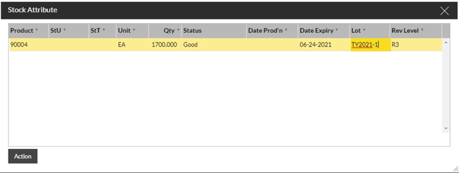 The Date Expiry or Lot or Rev Level can be changed or all these attributes can be changed. The Action button is then clicked. |