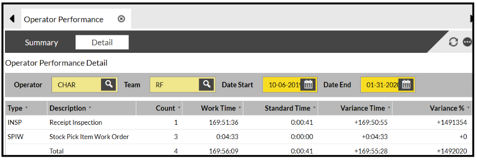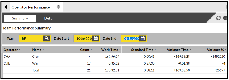 - Variance % - This is a calculated figure and uses the following formula: ((Standard Time / Variance Time) x 100).