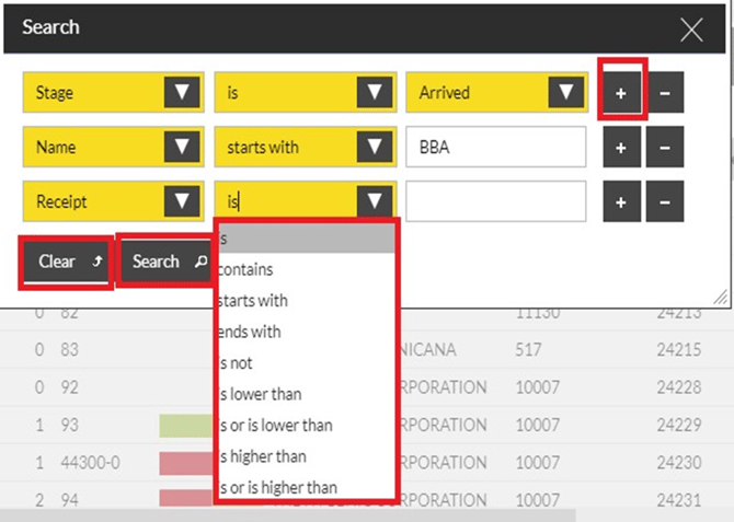 A user can choose and comparison criteria from the dropdown like is, greater than, contains, starts with etc. To apply the filter the Search button is clicked. To clear the filter the Clear button is clicked.