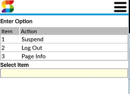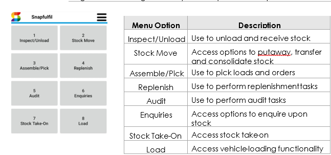 Purpose: The following image and table provide information about the menu that displays for manual-mode users after successfully logging in to the SnapFulfil RF gun. The functionality available within each option may differ for you depending on your permissions.