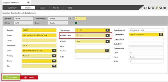 4 Select the appropriate Receipt Lane if not populated from the dropdown list, then click Confirm. |