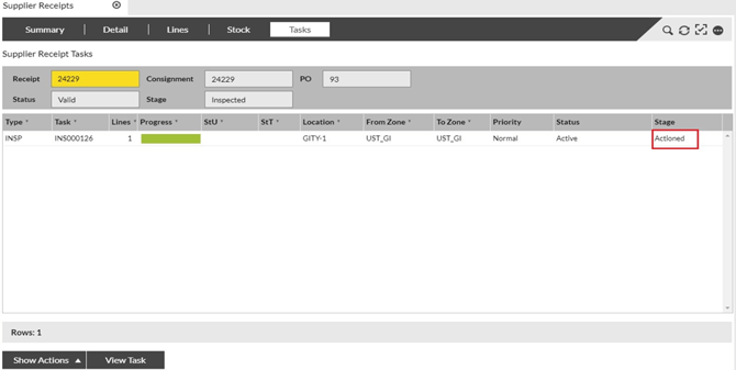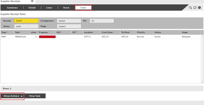 Click on the appropriate receipt within the list to select it, then click the Tasks tab (at the top of the page) to display the following screen. Click Show Actions. |