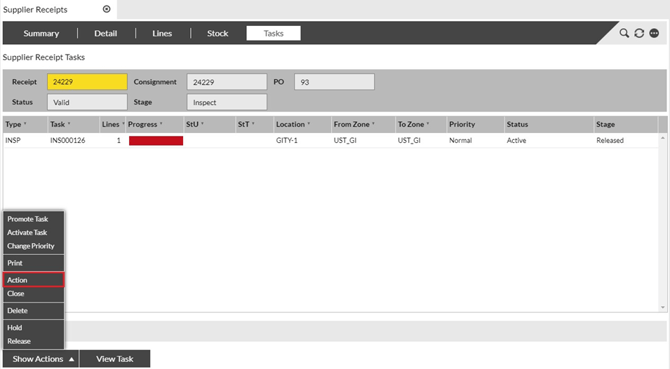 This will “Action” the INSP task and allow for the receipt to be closed. |
