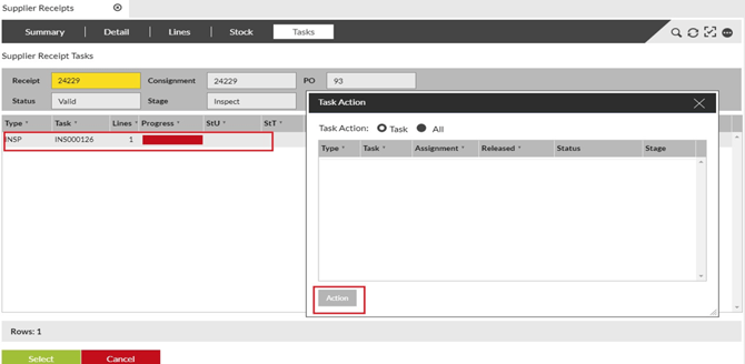 Drag or double click the INSP task from the Tasks tab into the Task Action pop-up window, then click Action. |