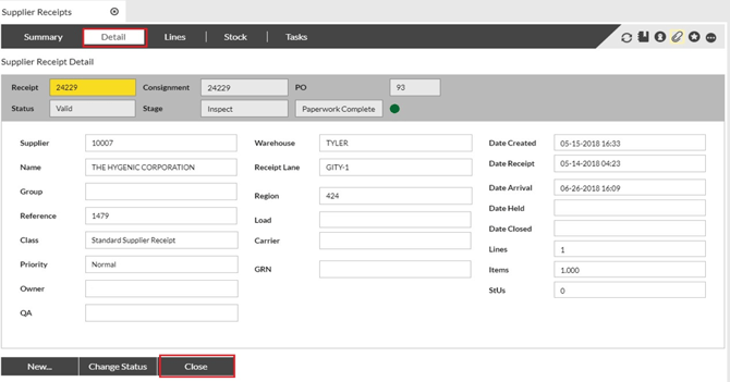 To close the receipt, click the Detail tab to display the following screen, then click Close. |