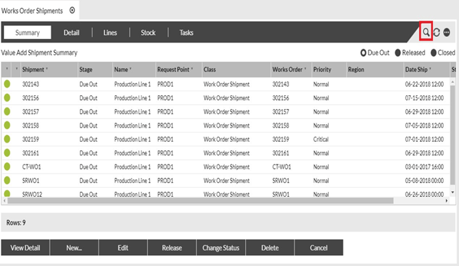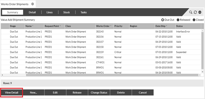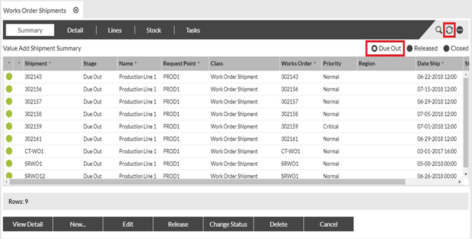 The Summary tab displays all successfully interfaced work orders. To view newly interfaced work orders, click Due Out, then click the green refresh arrow in the upper right corner. |