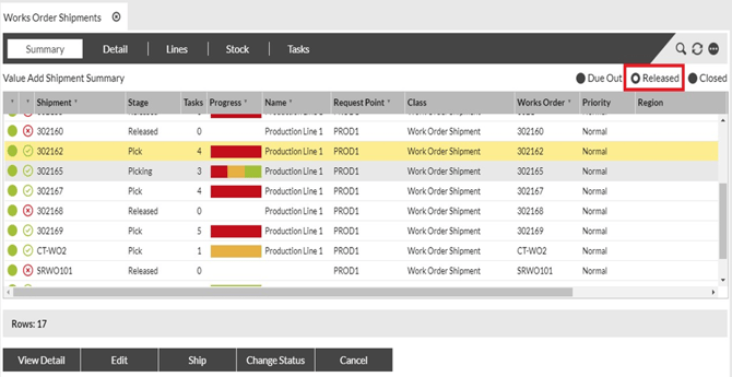 Click Released in the Summary tab to show customer orders that have pick tasks generated for them. The orders will be in Released or Pick stages. |