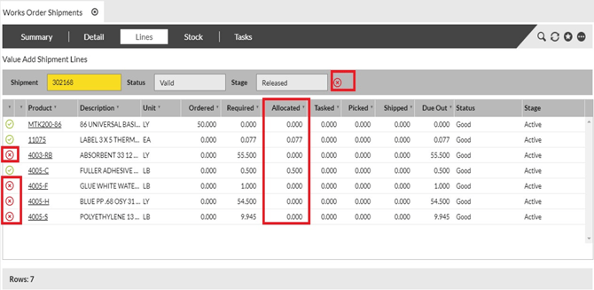 To view orders with shortages, click the Lines tab (at the top of the page). Any order lines with a shortage have a red X next to them.