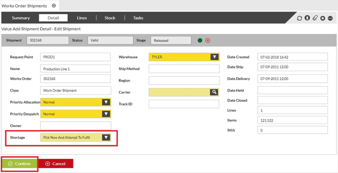 On the Detail tab, click Edit and Choose Pick Now and Attempt to Fulfil Shortage option. This will create a pick task for the available components. |