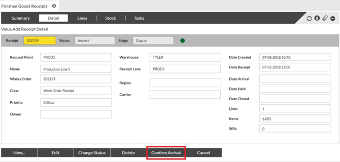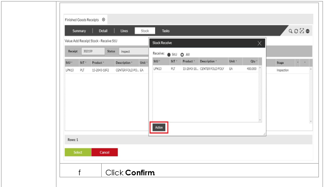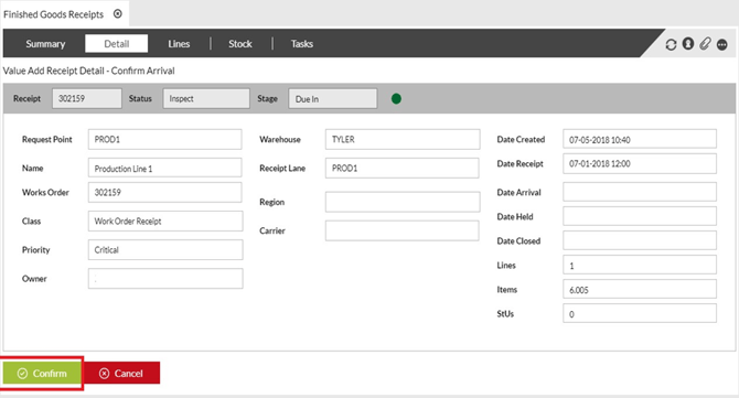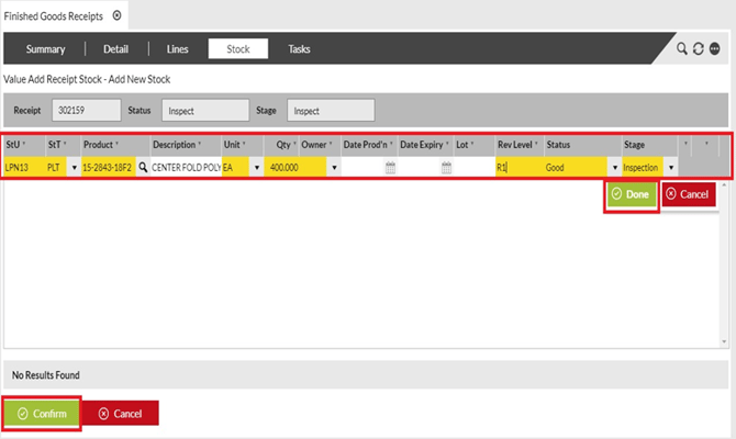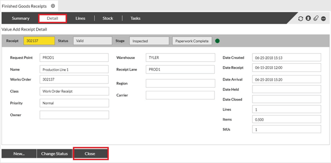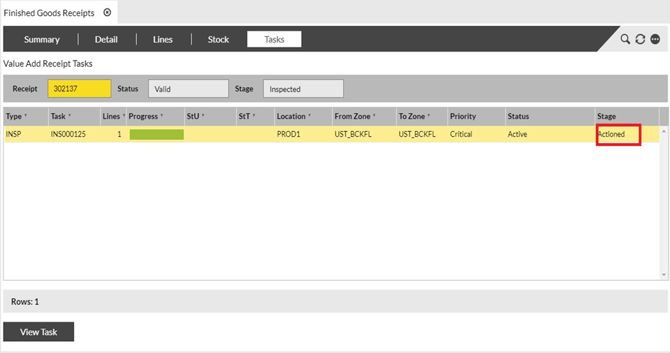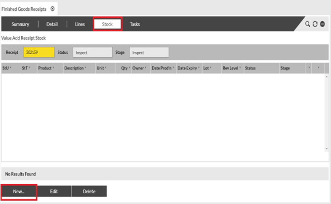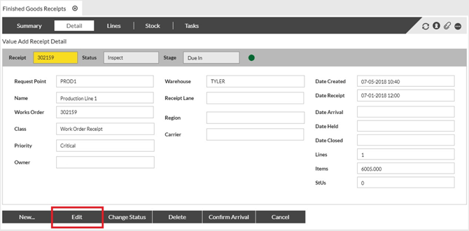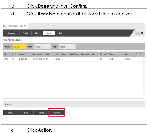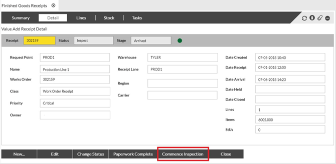 Purpose: In order to receive finished good stock against a Finished Goods Receipt, the stage of the receipt must first be advanced to “Inspect”. The following table outlines the steps for this process.
