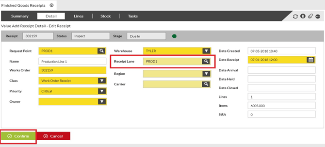 4 Select the appropriate Receipt Lane from the dropdown list, then click Confirm. |