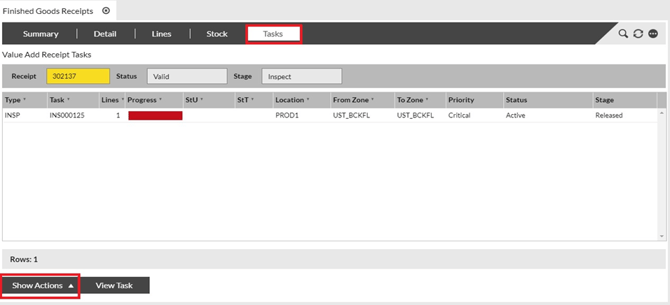 Click on the appropriate receipt within the list to select it, then click the Tasks tab (at the top of the page) to display the following screen. Click Show Actions. |