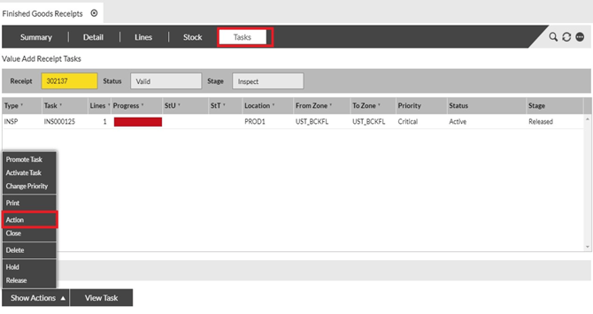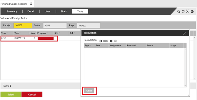 Drag or double click the INSP task from the Tasks tab into the Task Action pop-up window, then click Action. |
