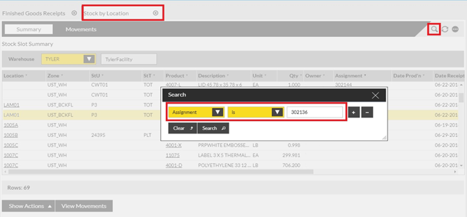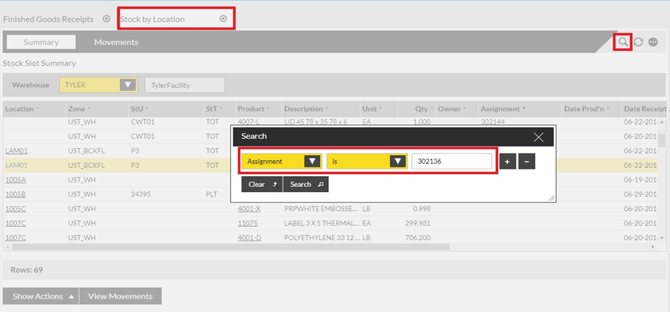 Select Inventory from the main menu, then select Stock by Location and search for the Work Order (Assignment is Work Order#). |