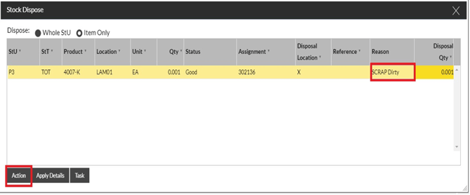 2 Select Show Actions and Dispose. The Stu or Item can be scrapped. |