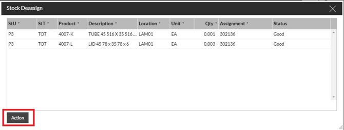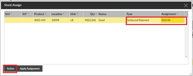 Click Show Actions button and choose Assign. Drag in the product and choose Outbound Shipment from the Type dropdown. Enter the work order to which the product quantity is being allocated to in the Assignment prompt. Click Action button. |