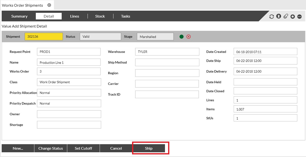 Select the Work Order and click the Detail tab. Click the Ship button and Confirm to close the shipment. |