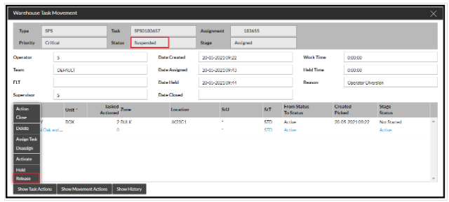 You may come across a task that is in a 'Suspended' status. This will prevent work being assigned to users (RF operator or Pack Station user).