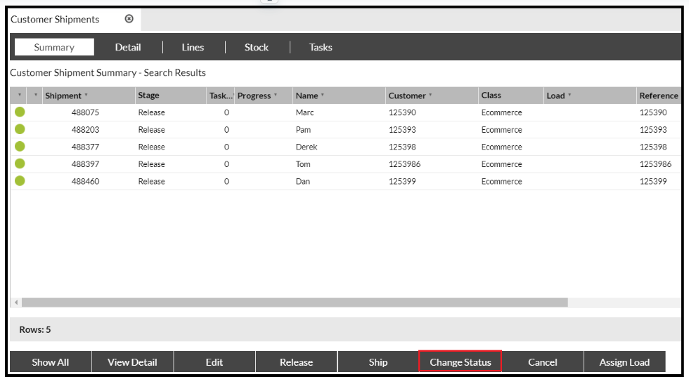 On the Shipment Summary screen select 'Change Status.'