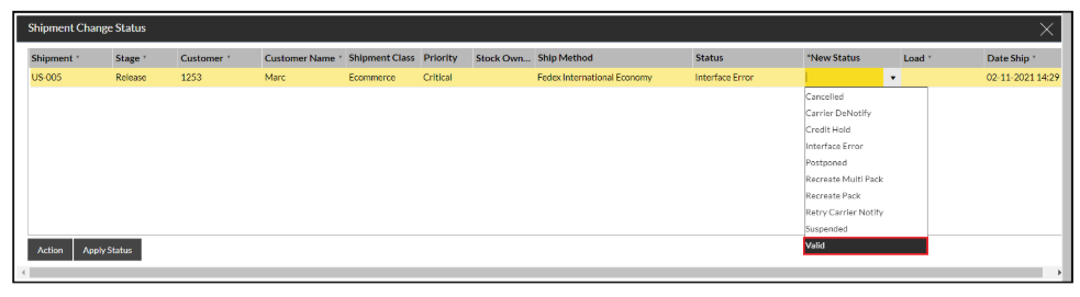Once the shipment/s are in the box, click in the column under 'New Status.'